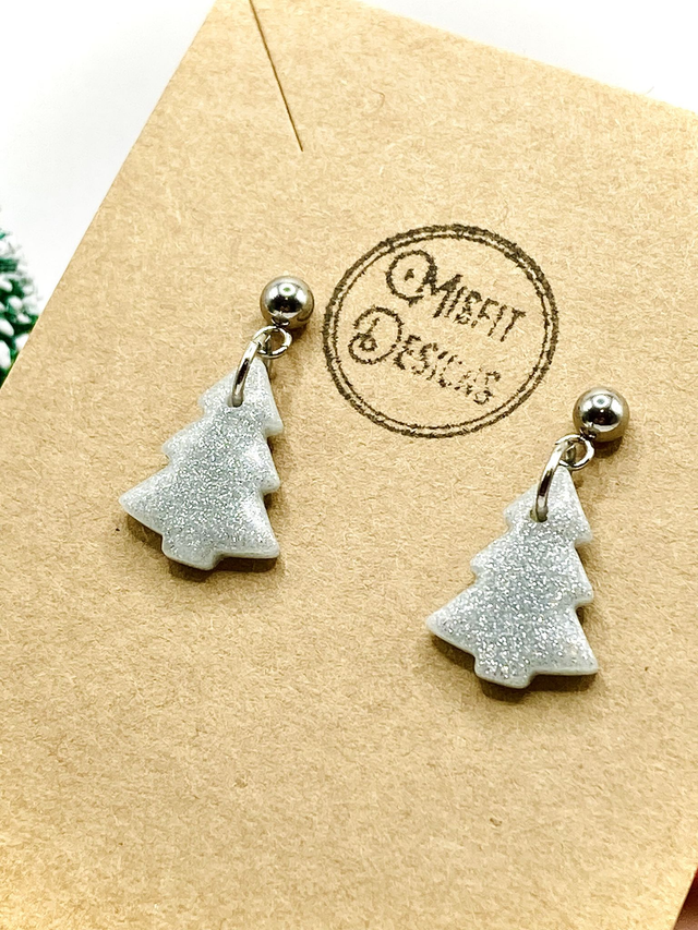 Silver sparkly Christmas tree drop earrings.