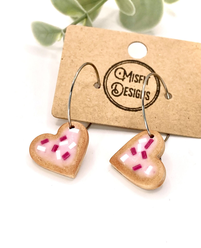 Iced cookie heart shaped earrings on a stainless steel hoop. Heart 15mm x 15mm, overall drop 33mm