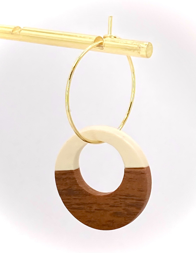 Cream and ‘wood’ cut out circle suspended from a gold plated hoop. Circle 20mm across, overall drop 38mm